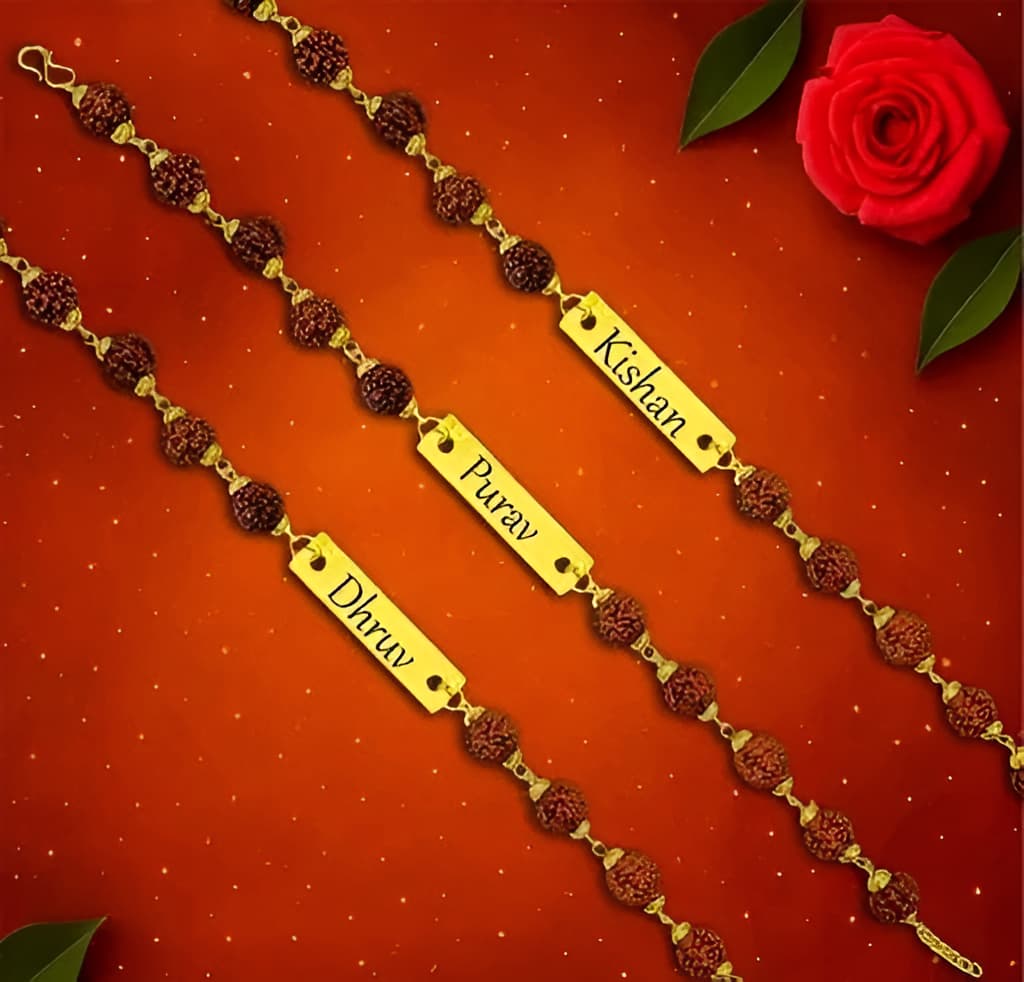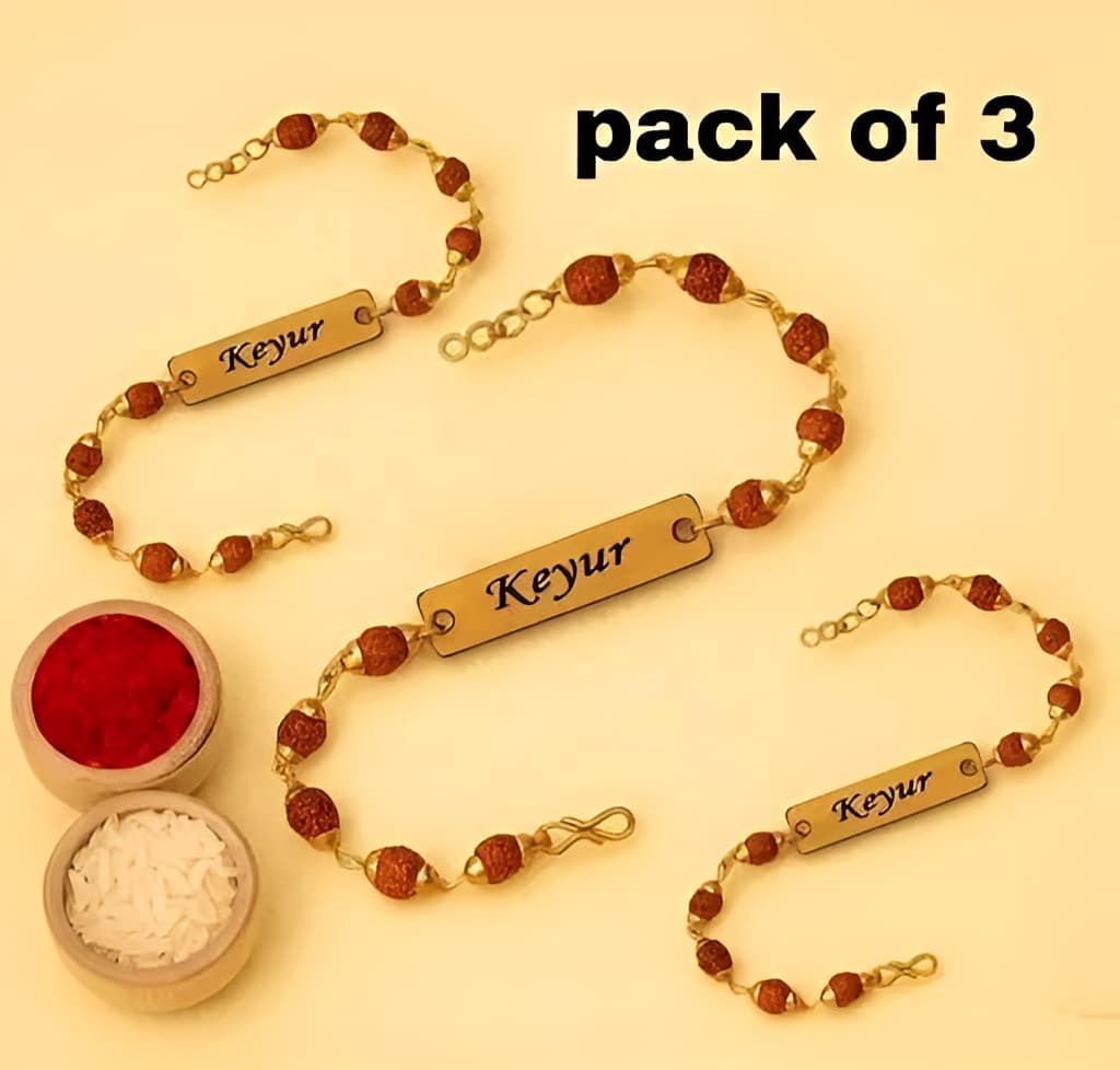 Custom Name Rudraksha Rakhi with Golden Metal Plate – Eco-Friendly & Personalized Raksha Bandhan Pack Of 3 Rakhi